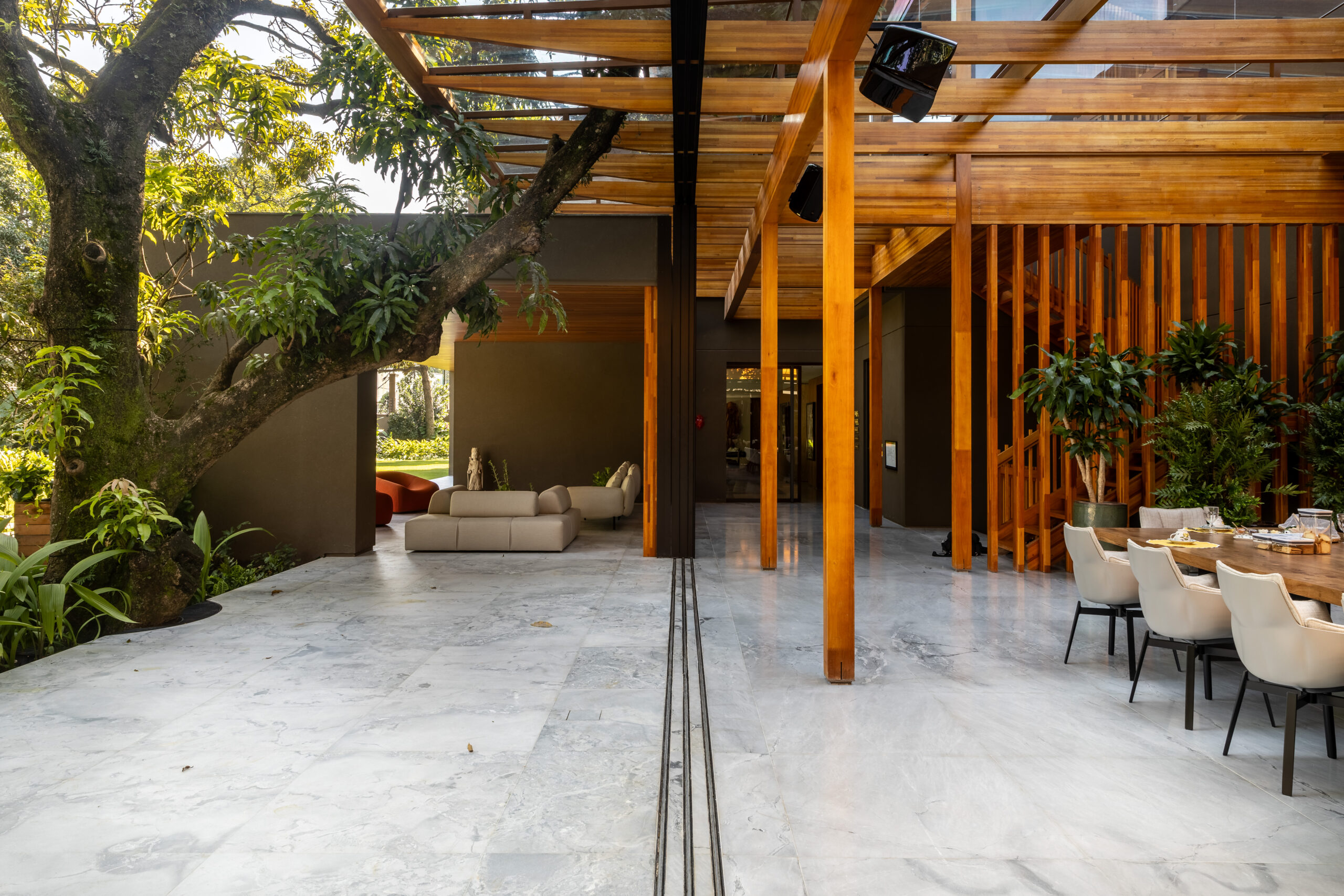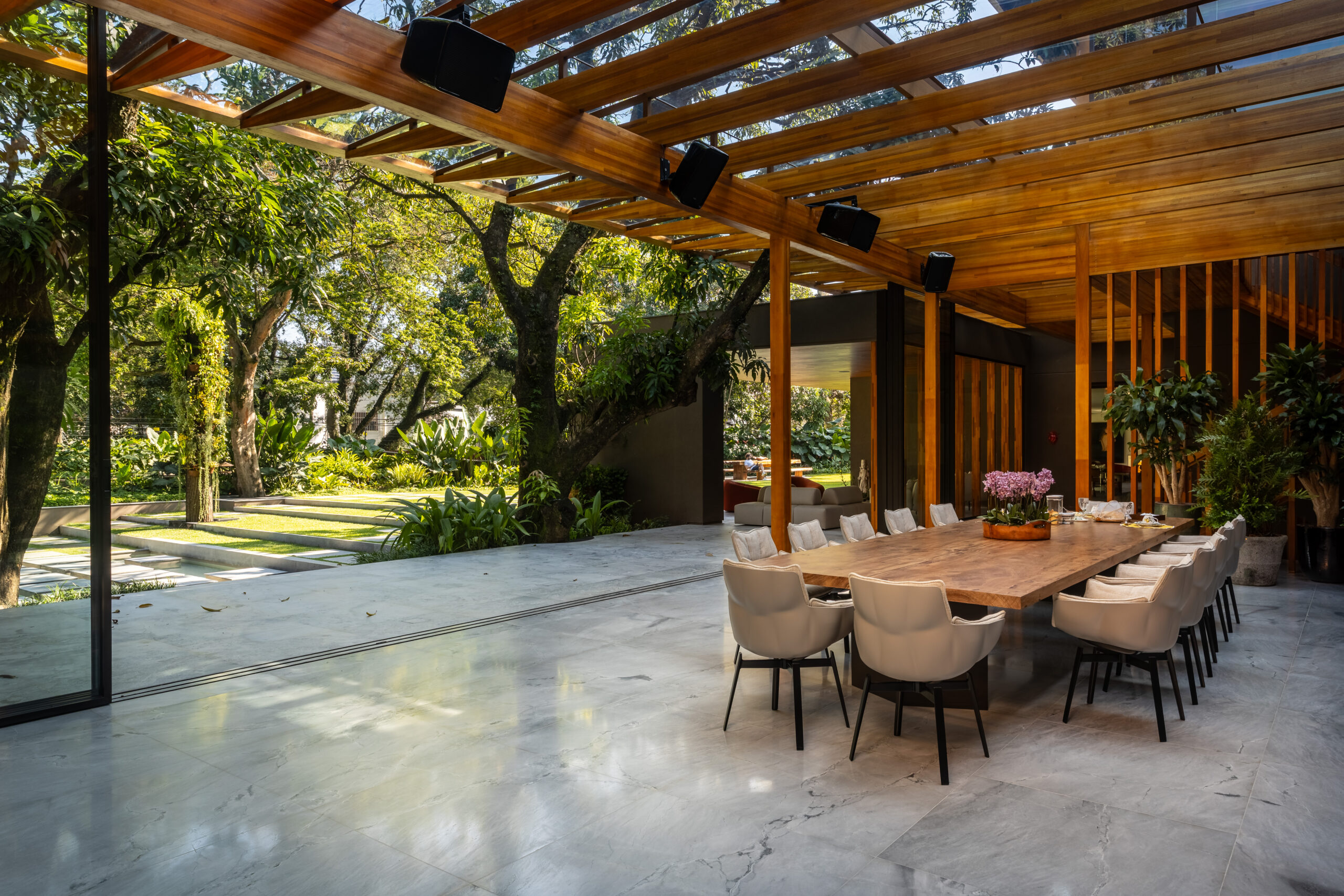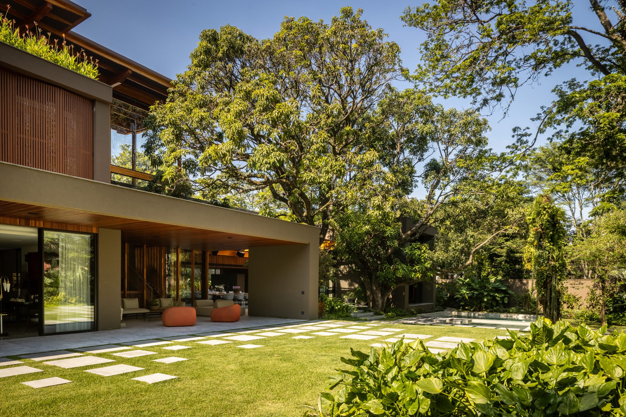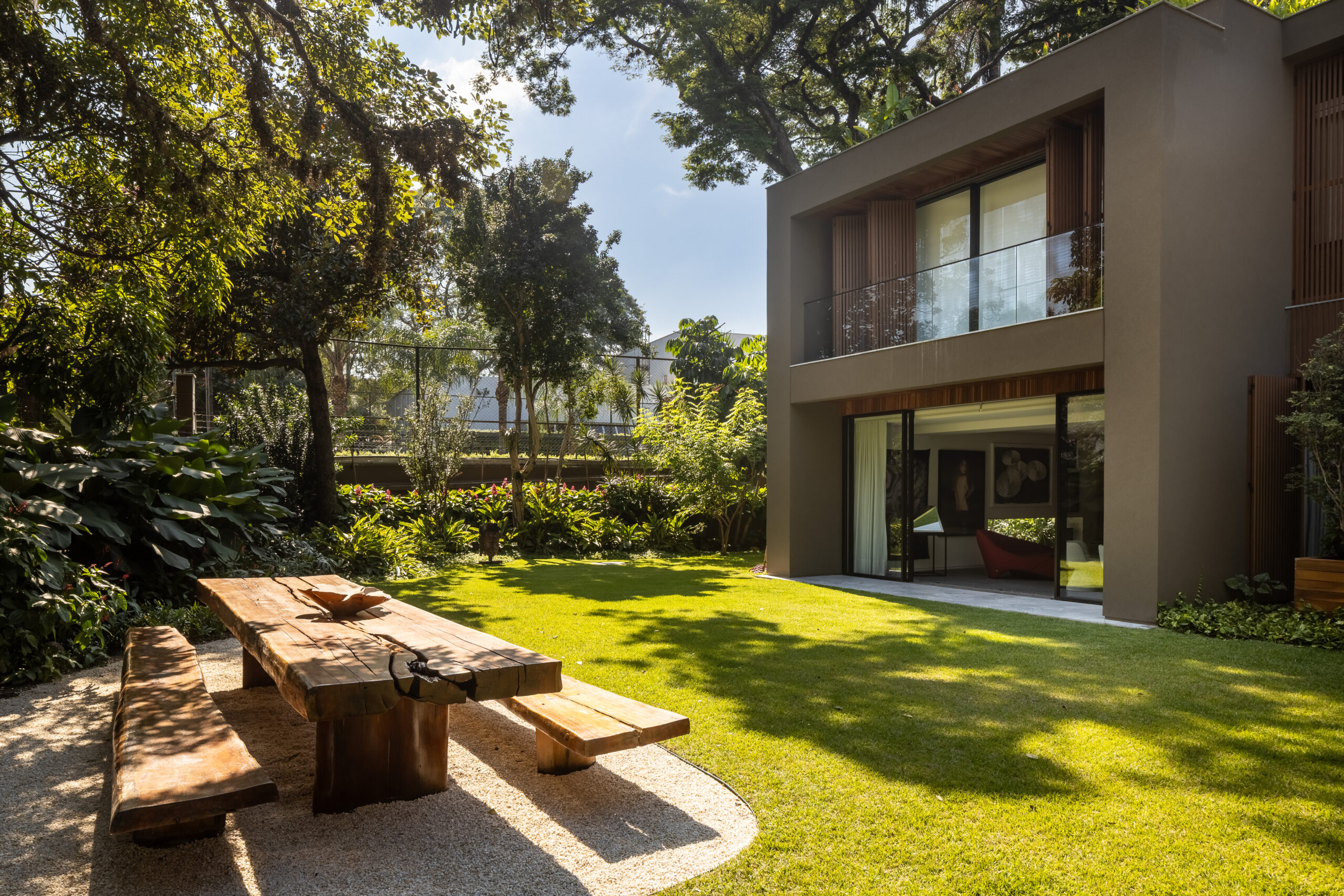 Desde o subsolo, projetado para acomodar mais de 12 carros, até o terreno exuberante com suas árvores majestosas, tudo foi pensado para proporcionar um ambiente de luxo e conforto. Os espaços internos, concebidos por João Armentano, harmonizam perfeitamente design e funcionalidade, enquanto o paisagismo de Alex Hanazaki emoldura a residência com beleza natural.